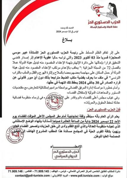 Le parti a appelé les forces vives de la société tunisienne à soutenir cette mobilisation, affirmant qu’elle sert les intérêts de la Tunisie. Ce rassemblement, prévu le 22 décembre 2024 à partir de 10 heures devant le siège du Conseil provisoire de la magistrature, a pour objectif d’exiger la fin de la situation provisoire du système judiciaire, jugée source d’injustice et de restrictions des libertés.