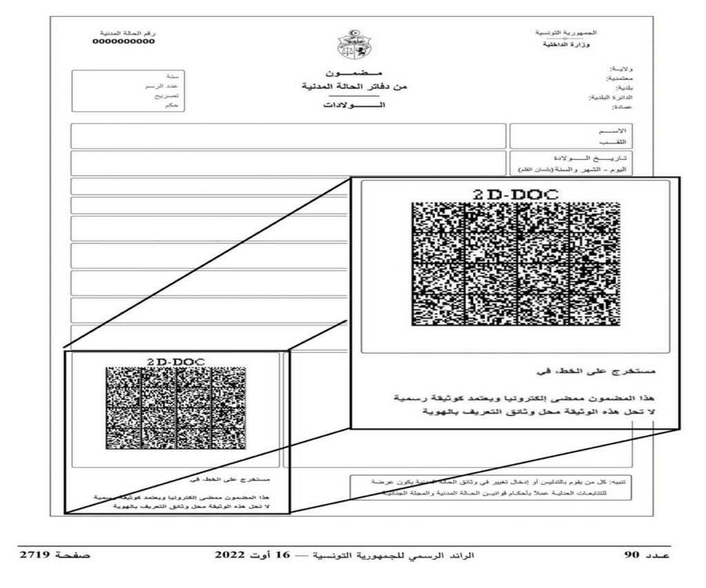 أفادت وزارة تكنولوجيات الاتصال، أمس الثلاثاء، بأن اعتماد مضمون الحالة المدنية الممضى إلكترونيا، أصبح رسميا في الإجراءات الإدارية، وذلك إثر صدور قرار مشترك عن كل من وزير الداخلية ووزيرة العدل ووزير تكنولوجيات الاتصال، مؤرخ في 16 أوت 2022، بالرائد الرسمي للجمهورية التونسية، والمتعلق بضبط أنموذج وثيقة مضمون الولادة المستخرج على الخط والممضى إلكترونيا وفقا للتشريع وللتراتيب الجاري بها العمل في حماية الوثائق باستعمال الأختام المرئية الموثوقة.