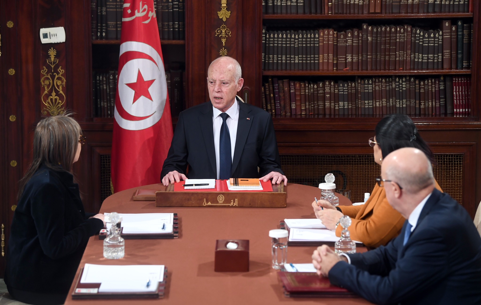 عقد رئيس الجمهورية قيس سعيّد، صباح اليوم الإثنين 16 جانفي 2023 بقصر قرطاج، جلسة عمل مع كلّ من نجلاء بودن رمضان، رئيسة الحكومة، وسهام البوغديري نمصية، وزيرة المالية، ومروان العبّاسي، محافظ البنك المركزي.