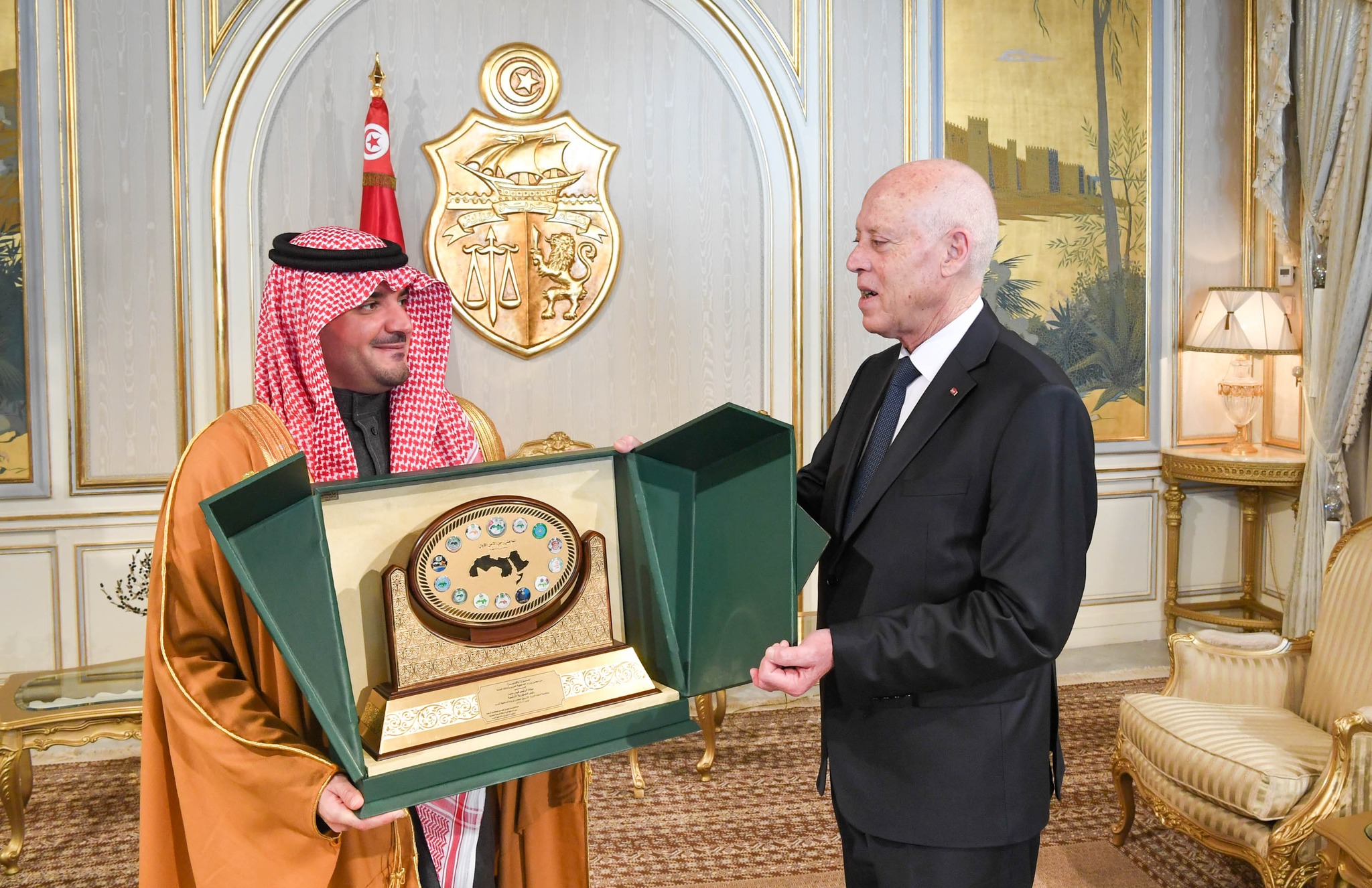 وتسلّم رئيس الجمهورية بالمناسبة، من الأمير عبد العزيز بن سعود بن نايف بن عبد العزيز آل سعود وزير الداخلية بالمملكة العربية السعودية والرئيس الفخري لمجلس وزراء الداخلية العرب، والأمين العام لمجلس وزراء الداخلية العرب محمد بن علي كومان، الدرع التذكاري للمجلس، وفق بلاغ صادر عن رئاسة الجمهورية.