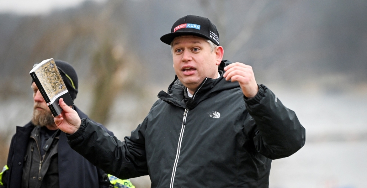 Leader of the far-right Danish political party Stram Kurs Rasmus Paludan during a manifestation outside the Turkish embassy in Stockholm, Sweden, January 21, 2023. Fredrik Sandberg/TT News Agency/via REUTERS ATTENTION EDITORS - THIS IMAGE WAS PROVIDED BY A THIRD PARTY. SWEDEN OUT. NO COMMERCIAL OR EDITORIAL SALES IN SWEDEN.