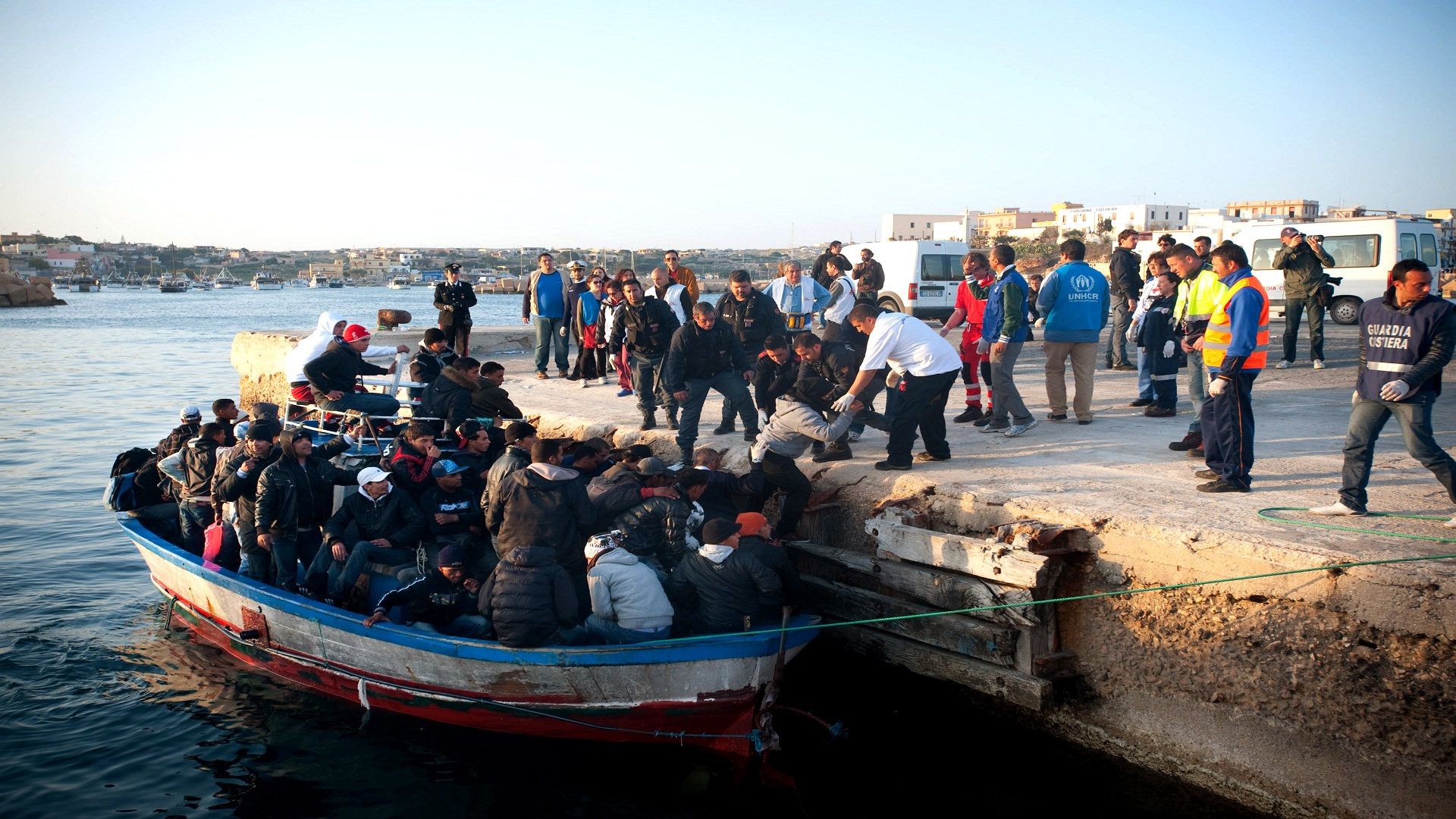 LAMPEDUSA, ITALY - MARCH 27: Immigrants from Tunisia arrive on a boat to the sea port, on March 27, 2011 in Lampedusa, Italy. A humanitarian emergency has been declared by the Italian government as over 5000 migrants have arrived on the island of Lampedusa in recent days, following the recent political turmoil in Tunisia and North Africa. (Photo by Giorgio Cosulich/Getty Images)