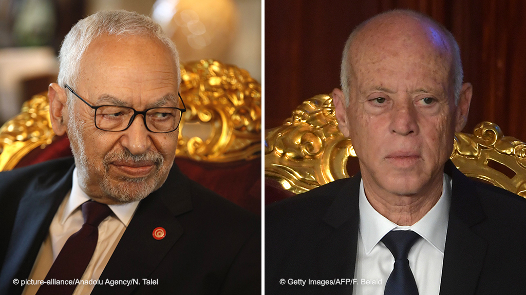 TUNIS, TUNISIA - JANUARY 09 : Tunisia's Speaker of the Assembly of the Representatives of the People, Rached Ghannouchi meets Minister of Foreign Affairs of France, Jean-Yves Le Drian (not seen) in Tunis, Tunisia on January 09, 2020. Nacer Talel / Anadolu Agency | Keine Weitergabe an Wiederverkäufer. rechts: Tunisia's new President Kais Saied takes the oath of office on October 23, 2019 at the parliament in Tunis. - Saied, a conservative academic with no previous political experience who won the overwhelming support of younger voters in an October 13 runoff, was sworn in before members of the constituent assembly and other top state bodies. (Photo by Fethi Belaid / AFP) (Photo by FETHI BELAID/AFP via Getty Images)