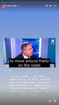 وقالت بيلا حديد: “لا يوجد مكان في أي وقت وخاصة في عام 2023، تكون فيه حياة شخص أكثر أهمية من حياة شخص آخر.. لا سيما بسبب أصله أو ثقافته أو كراهيته الخالصة”.