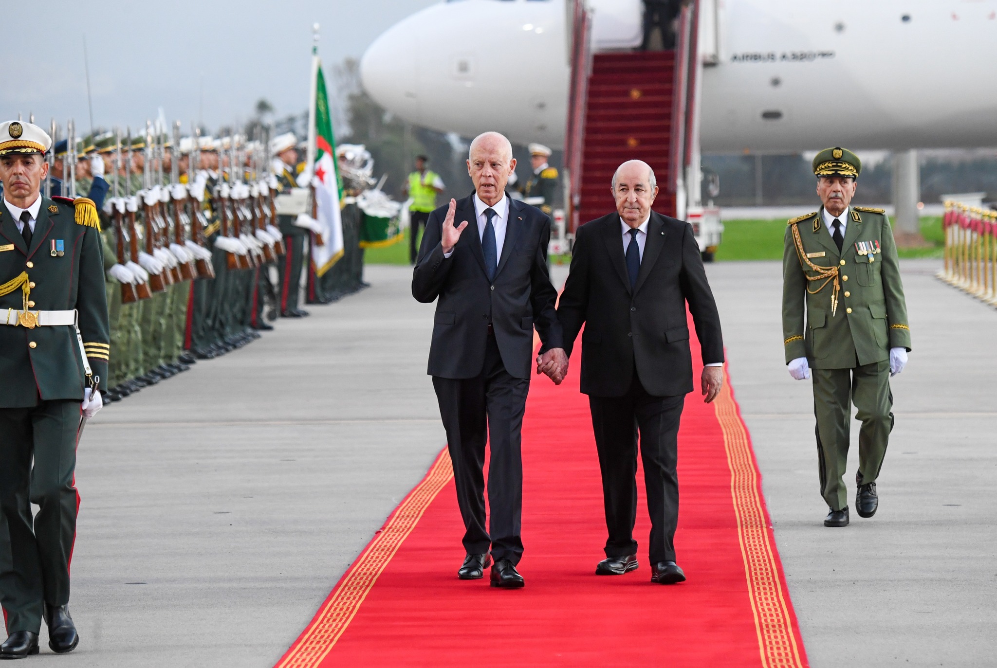 رئيس الجمهورية يحل بالجزائر للمشاركة في الاحتفال بذكرى اندلاع ثورة التحرير الجزائريةحلّ رئيس الجمهورية قيس سعيّد، مساء اليوم الخميس، بالجزائر العاصمة للمشاركة في الاحتفال بالذكرى 70 لاندلاع ثورة التحرير الجزائرية. وكان في استقبال رئيس الدولة لدى حلوله بالمطار الدولي هواري بومدين بالجزائر العاصمة، نظيره الجزائري عبد المجيد تبون. وحيا الرئيسان العلم على أنغام النشيدين الرسميين للبلدين قبل أن يستعرضا تشكيلة شرفية من الجيوش أدت لهما التحية. وكان رئيس الجمهورية قيس سعيّد غادر ظهر اليوم أرض الوطن في اتجاه الجزائر تلبية لدعوة من الرئيس عبد المجيد تبون. وكان في توديعه رئيس الحكومة كمال المدوري ووالي تونس عماد بوخريص والكاتب العام المكلف بتسيير بلدية تونس لطفي الدشراوي وأعضاء الديوان الرئاسي وسعادة سفير الجمهورية الجزائرية الشعبية بتونس.