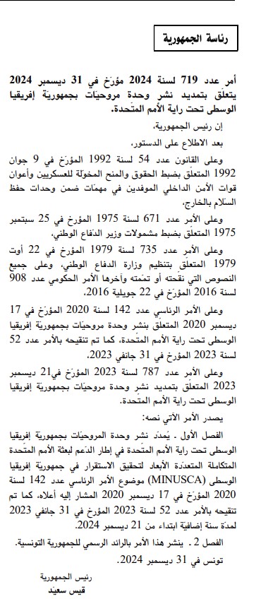 صدر بالعدد الأخير الرائد الرسمي للجمهورية التونسية بتاريخ أمس، الجمعة 3 جانفي 2025، أمر رئاسي يتعلق بتمديد نشر وحدة مروحيات بجمهورية افريقيا الوسطى تحت راية الأمم المتحدة، لمدّة سنة إضافية بداية من 21 ديسمبر 2024