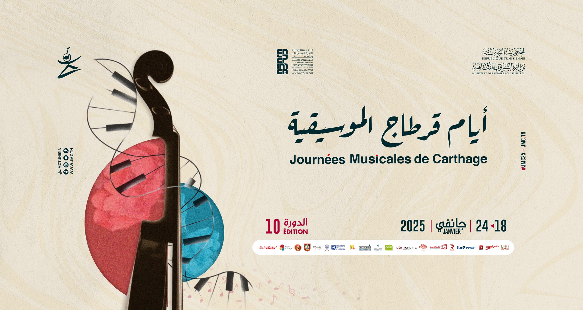 تنطلق الدورة العاشرة لأيام قرطاج الموسيقية يوم السبت 18 جانفي الجاري الى غاية 24 من نفس الشهر و البداية ستكون مع الساعة السادسة مساء بمسرح الاوبرا في مدينة الثقافة اين يؤثث الافتتاح ″لاخوسي ″ من اسبانيا .و في نفس التوقيت سيكون هناك عرض ″ارس نوفانابولي ″ من ايطاليا الذي سيقام في ساحة المسارح .