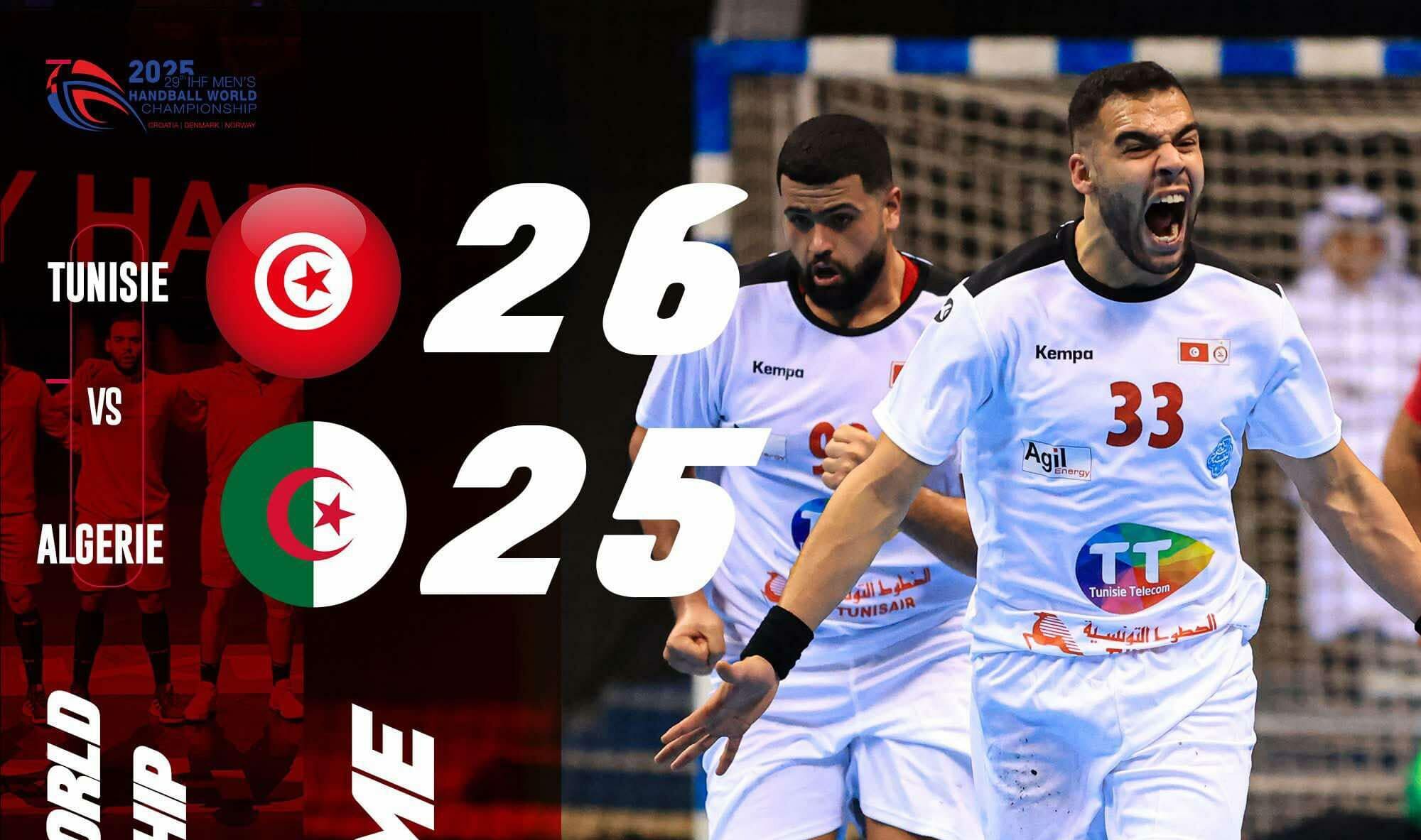 مرّت تونس إلى الدور الثاني من مونديال كرة اليد المقامة حاليا بين بلدان الدنمارك والنرويج وكرواتيا، بعد انتصار صعب بفارق نقطة وحيدة (26-25) على الجزائر.