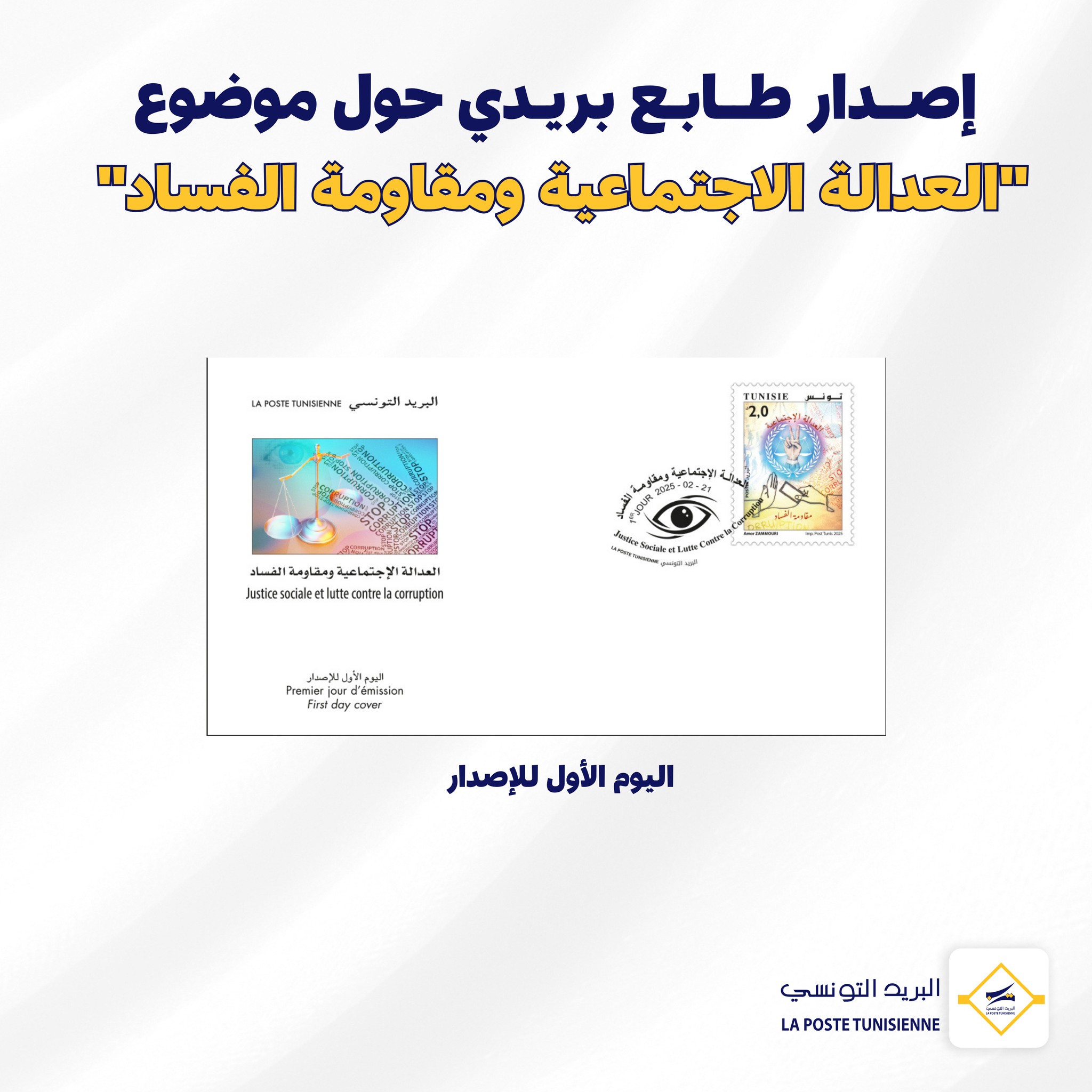 يصدر البريد التونسي، غدا الجمعة 21 فيفري 2025، طابعا بريديا حول موضوع العدالة الاجتماعية ومقاومة الفساد.