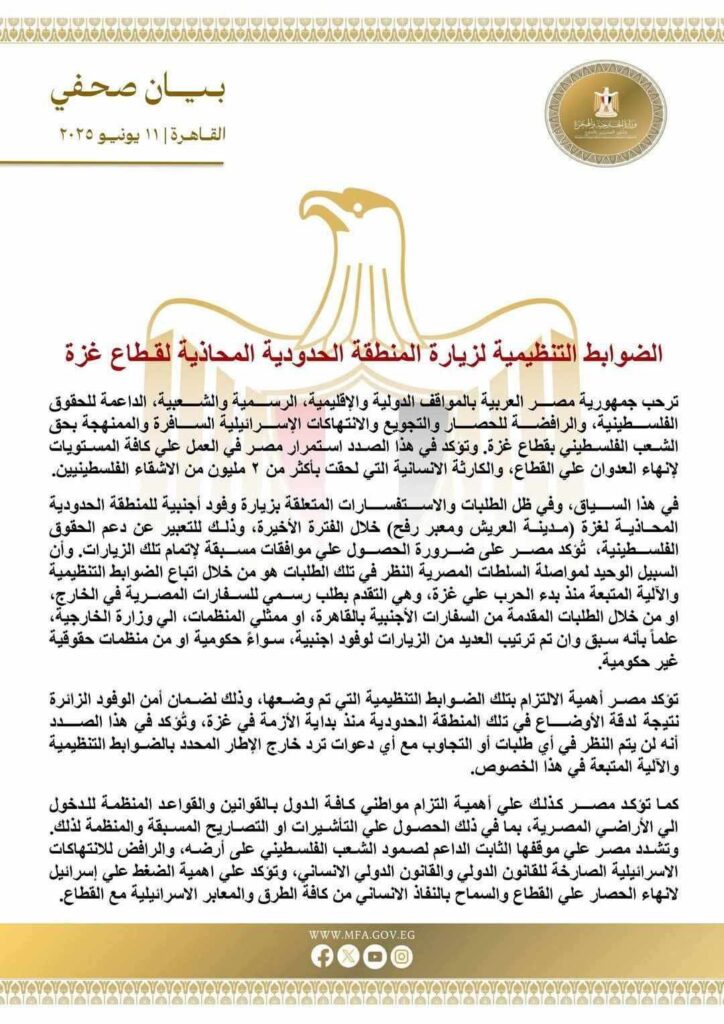 في بيان صحفي أصدرته اليوم الاربعاء 11 جوان 2025، اوضحت الخارجية المصرية انها لن تسمح للمشاركين في “قافلة الصمود” بمواصلة رحلتهم عبر التراب المصري والوصول.الى معبر رفح. وعلت.