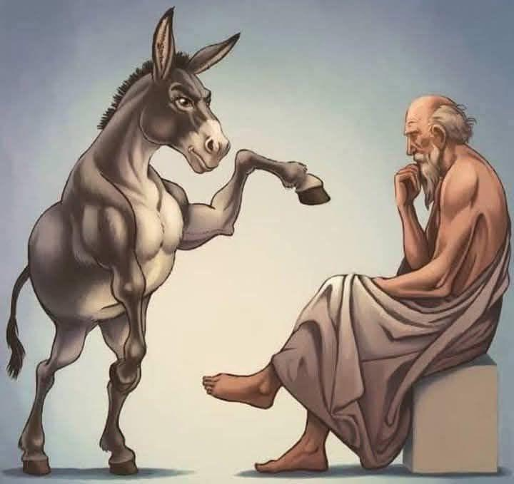 وبحسب المثل اللاتيني Asinus Asinum fricat (الحمار يحتك بالحمار) والذي يقابله الفصيح “إن الطيور على أمثالها تقع”، فقد نزّه سقراط ذاته عن الحمار ولم ينزل إلى الحضيض وآثر الصمت على مبادلة العنف بالعنف.