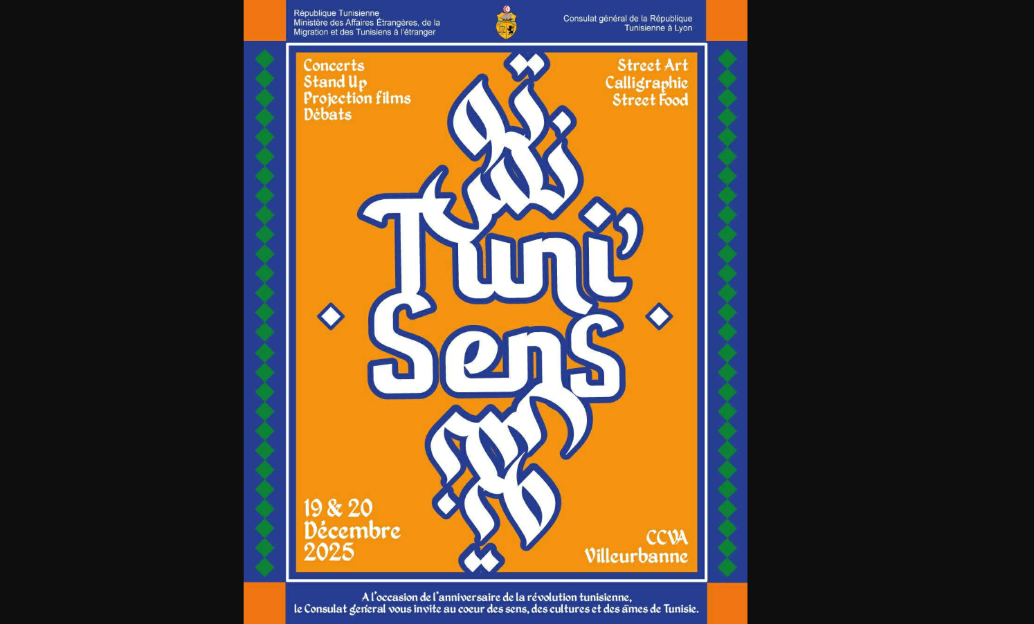 أعلنت القنصلية العامة لتونس بمدينة ليون الفرنسية عن احتضانها قريبا لمهرجان Tuni’Sens برعاية وزارة الشؤون الخارجية والهجرة والتونسيين بالخارج.