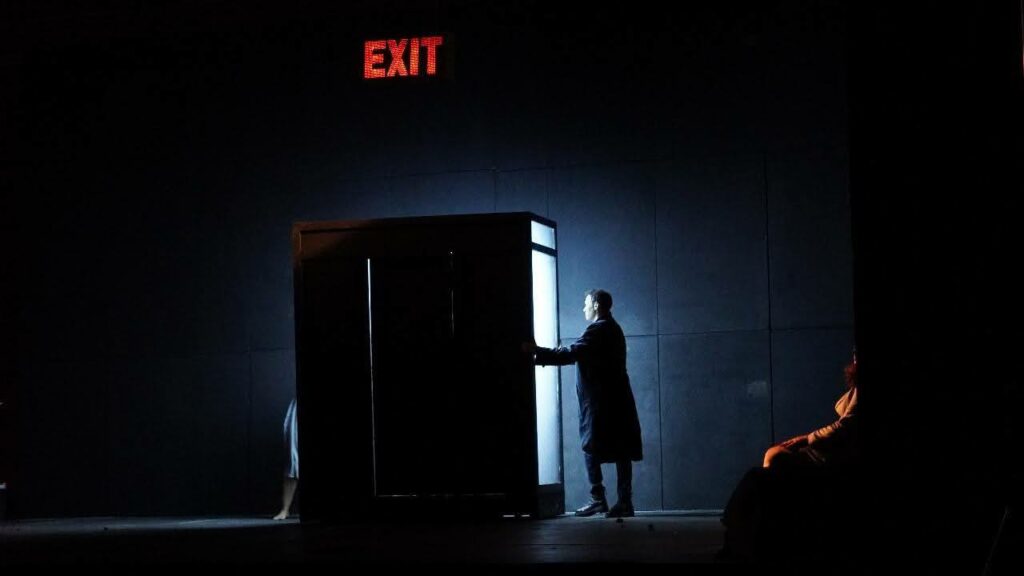 ولعل أكثر عنصر سينوغرافي كثافة في العمل: هو علامة  ( EXIT)الضوئية المعلقة بلونيها الأحمر والأخضر: باب موجود، لكنه لا يؤدي إلى مكان. وهذا بحد ذاته ينسف إمكانية النجاة، إنّ تعليقه ليس تزييناً مسرحياً، بل جملة وجودية. إشارة تحيل إلى وعد بالخلاص، لكنها تبقى مغلقة. يظل الضوء الأخضر يعمل، لكن الباب لا يفتح، وهذا ما يجعل EXIT ليست علامة خروج، بل علامة سقوط ، تتحول الكلمة إلى سيمياء للخداع، وتصبح جزءاً من جهاز السيطرة.
