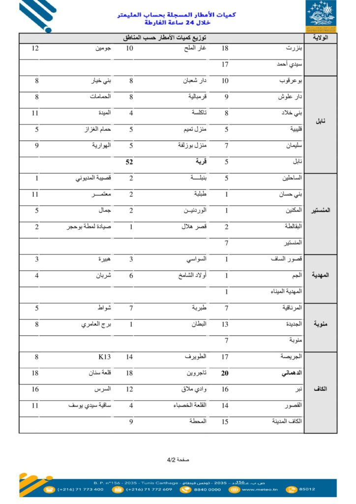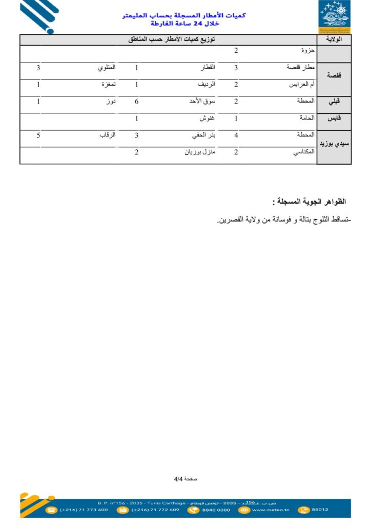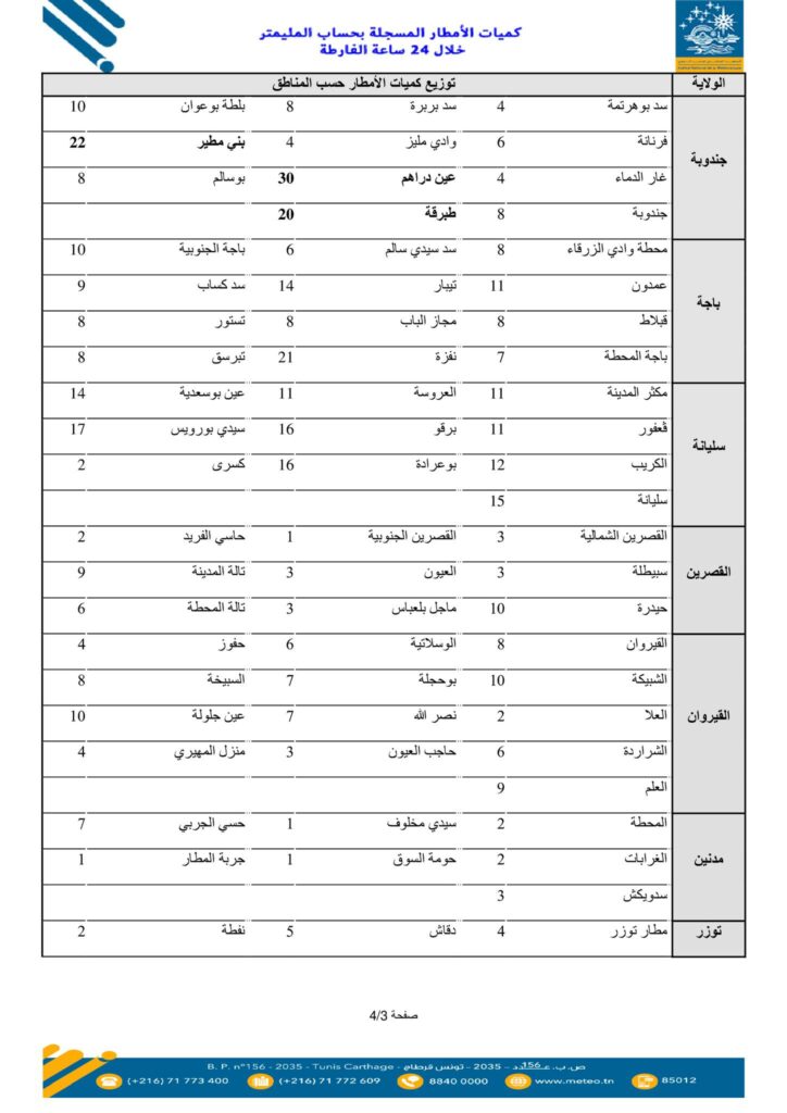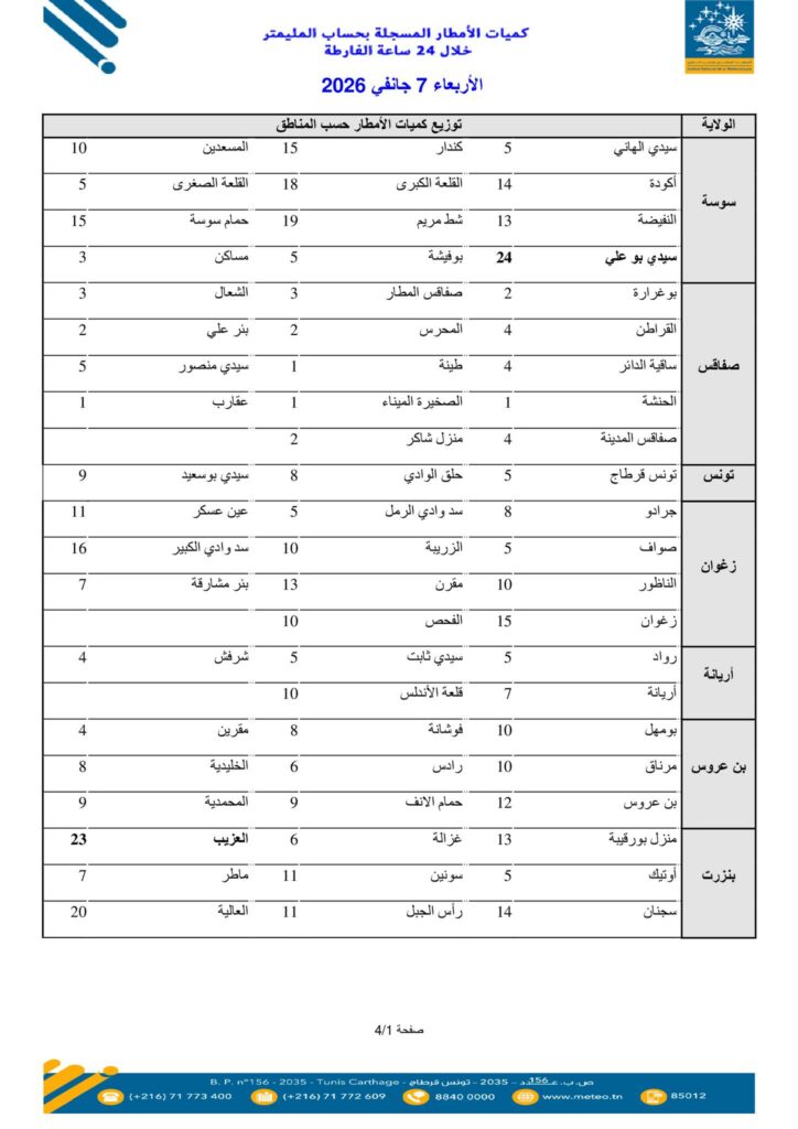 نشر المعهد الوطني للرّصد الجوي، اليوم الأربعاء 07 جانفي 2026، قائمة كميات الأمطار المسجلة بعدد من المناطق خلال الـ24 ساعة الأخيرة.
