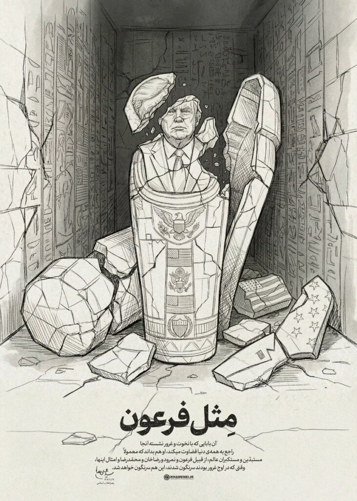 وعبر خامنئي عن هذا الموقف بنشر صورة لتمثال لترامب على هيئة مجسم فرعوني محطم.وكتب خامنئي بالفارسية تعليقا على الصورة، “ذلك الأب الذي يجلس هناك متكبرا مغرورا، ويحكم على العالم كله، عليه أن يعلم هو أيضا أن المستبدين والمتغطرسين في العالم، مثل فرعون ونمرود ورضا خان ومحمد رضا وأمثالهم، عادة ما سقطوا عندما كانوا في قمة غرورهم وهذا أيضا سيسقط، مثل فرعون”.