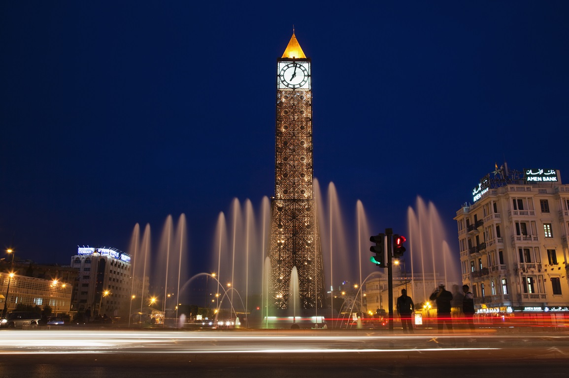 Tunisia, Tunis, Avenue Habib Bourguiba, Place du 7 Novembre 1987 clocktower, dusk