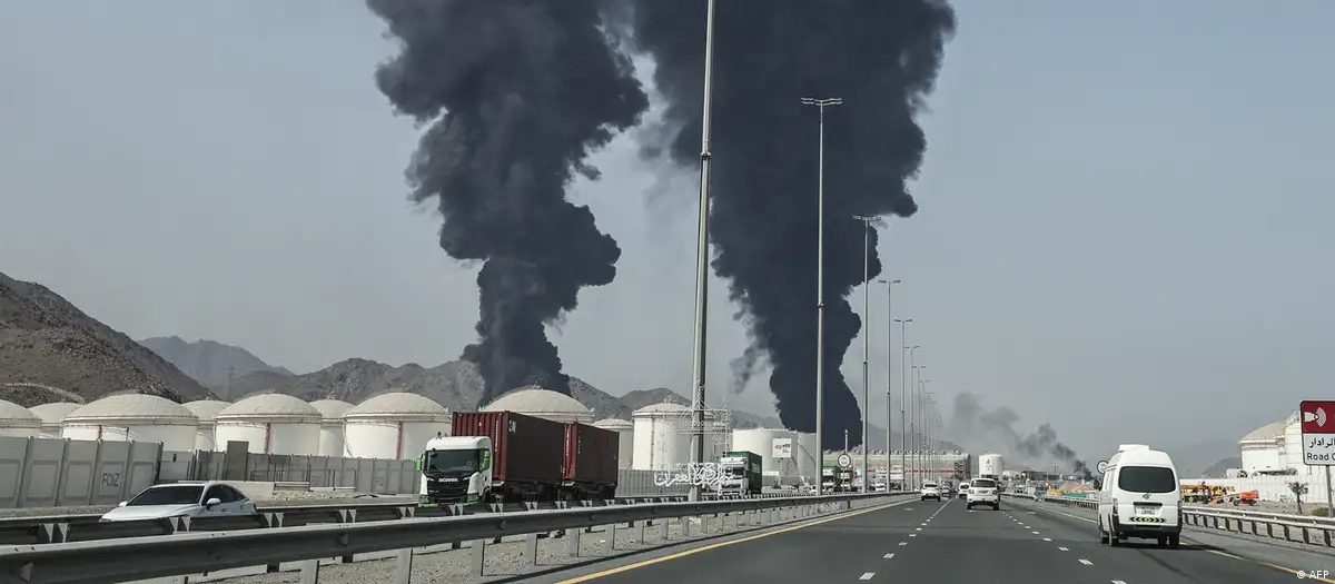 وذكرت وكالةةالانباء الالمانية أن سحبا كثيفة من الدخان الأسود شوهدت وهي تتصاعد من الفجيرة في الإمارات، التي تضم ميناء رئيسياً كانت هجمات إيرانية قد استهدفت فيه سابقاً مركزاً لتخزين النفط. كما يضم الميناء محطة كبرى لتصدير النفط. وقبل ذلك بدقائق، دعت القوات المسلحة الإيرانية السكان المقيمين في جوار موانئ الإمارات إلى الابتعاد عنها، معتبرة أنها أهداف مشروعة.