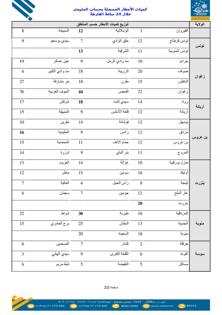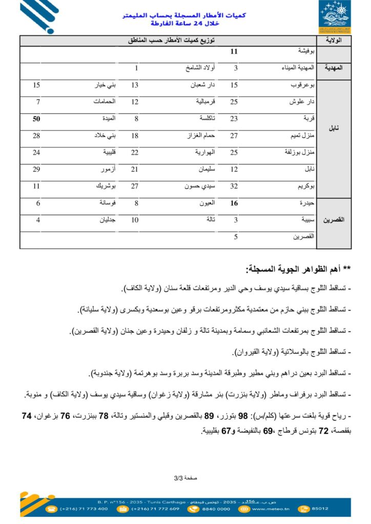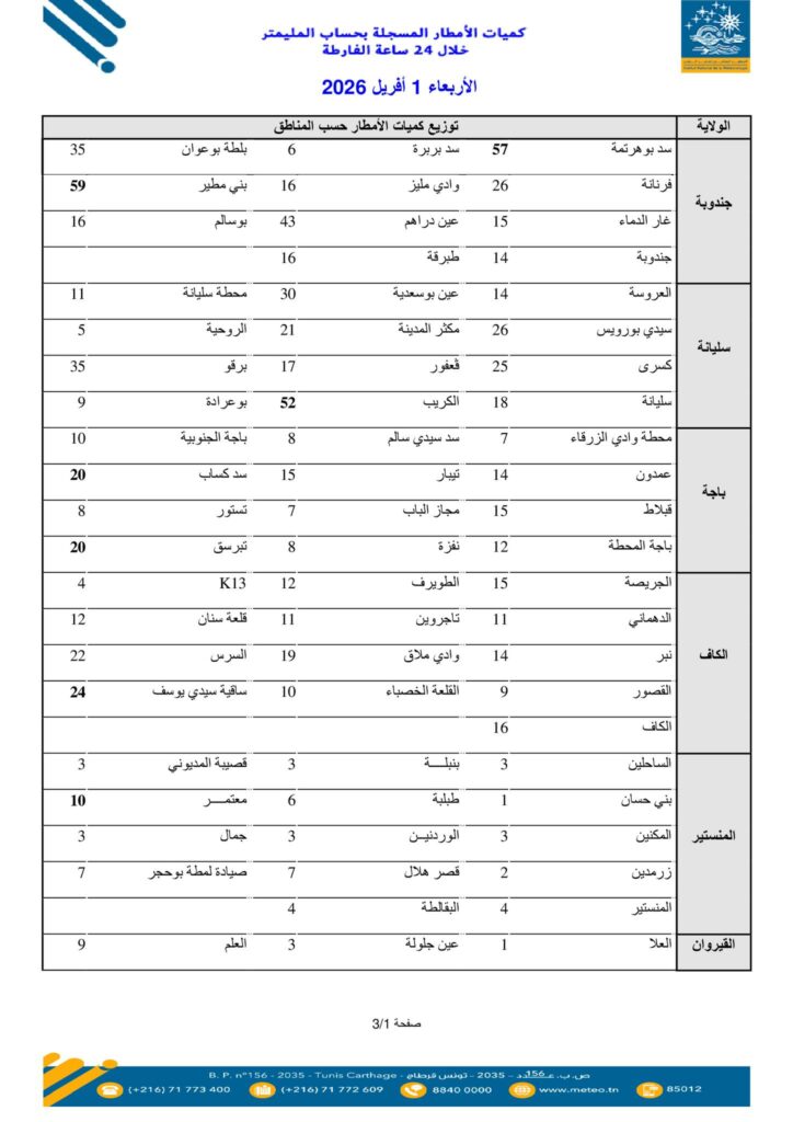 نشر المعهد الوطني للرّصد الجوي، اليوم الأربعاء 01 أفريل 2026، قائمة كميات الأمطار المسجلة بعدد من المناطق خلال الـ24 ساعة الماضية. وسجّلت مدينة بني مطير من ولاية جندوبة أعلى كميات من الأمطار بـ59 مم، يليها سدّ بوهرتمة بـ57مم ثم الكريب من ولاية سليانة بـ52 مم إلى جانب منطقة الميدة التابعة لولاية نابل بـ50 مم.
