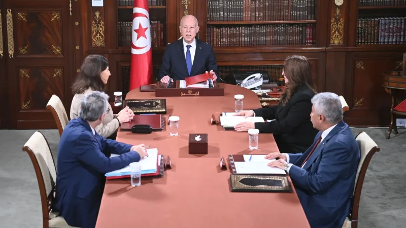 أشرف رئيس الجمهوريّة قيس سعيّد أمس الاثنين 27 أفريل 2026 على اجتماع ضمّ كلاّ من سارة الزعفراني الزنزري رئيسة الحكومة ومشكاة سلامة الخالدي وزيرة الماليّة وعصام الأحمر وزير الشّؤون الإجتماعية ورياض شوّد وزير التّشغيل والتّكوين المهني.
