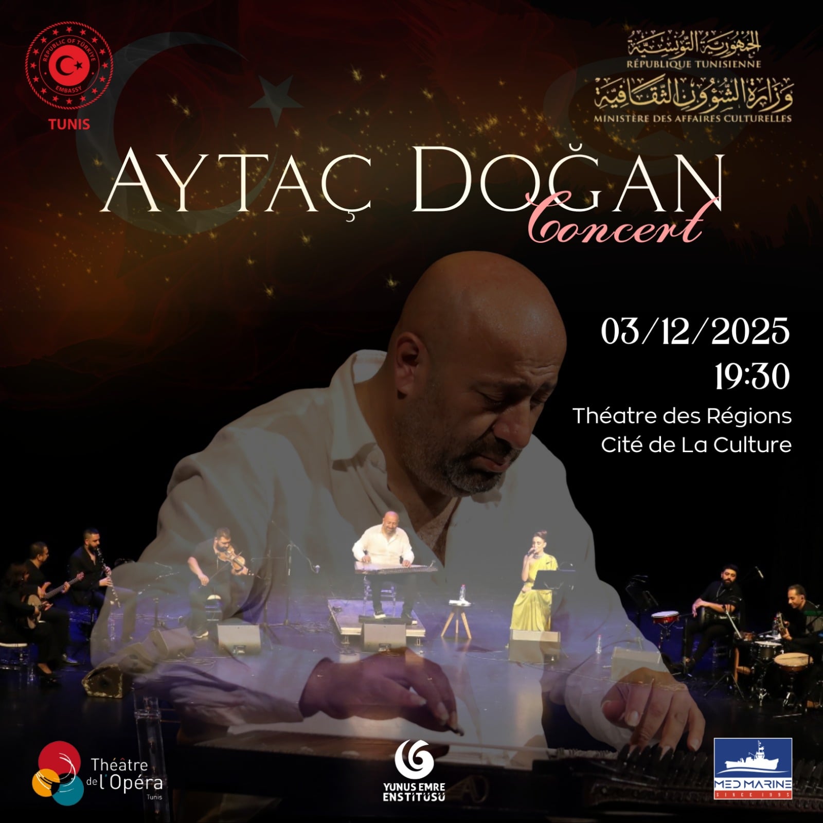 Une belle fin d’année en musique, en compagnie cette fois, du virtuose turc du kanun, Aytaç Dogan qui donnera un concert le mercredi 3 décembre 2025 à partir de 19h30 au Théâtre des Régions (Cité de la Culture). Un spectacle organisé par l’ambassade de Turquie, en collaboration avec le ministère tunisien des Affaires Culturelles et  avec le soutien de l’Institut Yunus Emre de Tunis, et le parrainage de Med Marine.