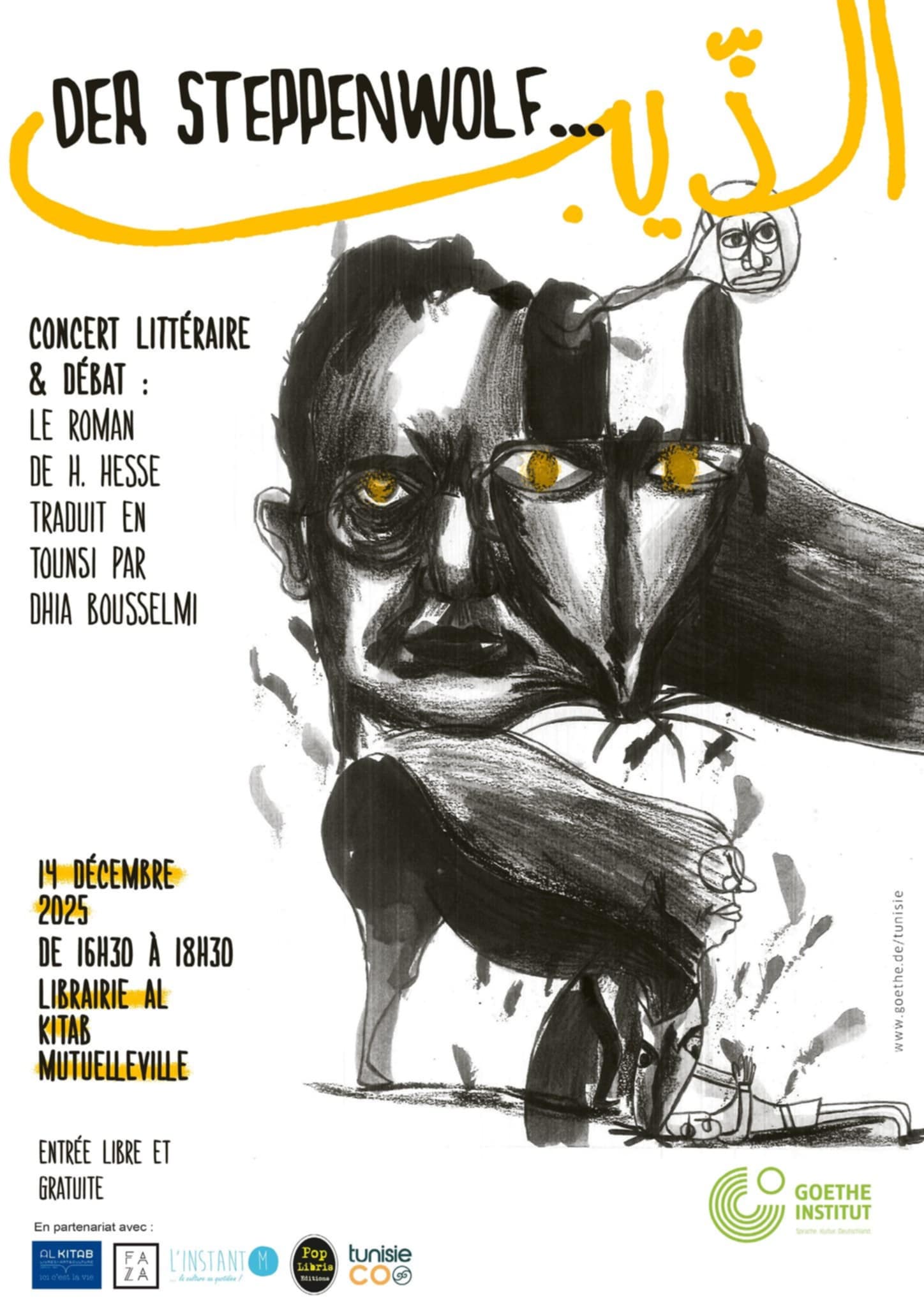 Le Goethe-Institut Tunis, en partenariat avec Pop Libris Editions et la librairie Al Kitab présentent un concert littéraire qui s’annonce mémorable. L’occasion pour les amateurs d’art et de littérature de découvrir la traduction du roman « Der Steppenwolf – Le Loup des steppes » en tunisien, devenu « El Dhib ». Le traducteur Dhia Bousselmi et Sami Mokkadem propriétaire de la maison d´édition Pop Libris se sont demandé ce qui se passerait si le loup des steppes errait dans les ruelles tunisiennes ? Et si Hermann Hesse parlait en tounsi, dans une langue faite de gouaille, de douleur et de poésie populaire ? Chef-d’œuvre de la littérature allemande du XXe siècle, interdit sous le régime nazi, ce roman culte de la culture hippie est devenu l’emblème du mouvement contestataire américain au cours de la guerre du Vietnam.