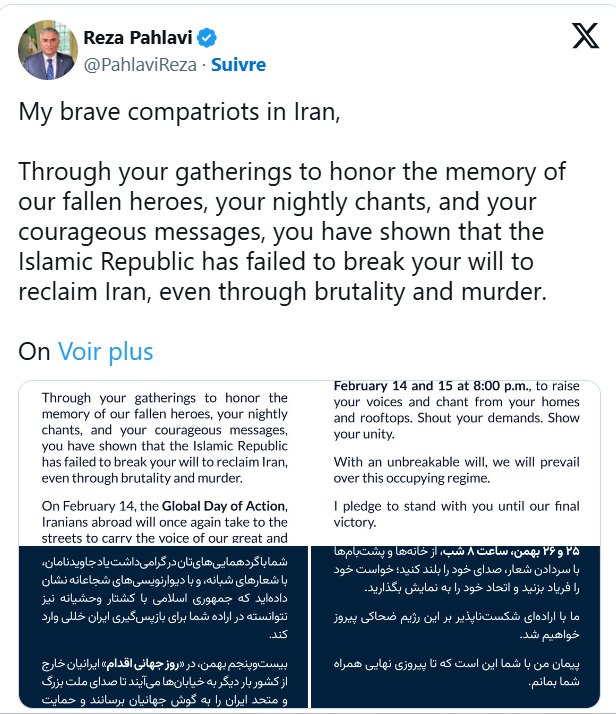 Dans un message publié jeudi sur X, Reza Pahlavi a appelé les Iraniens de l’intérieur à continuer leur mobilisation mais depuis chez eux. «Je vous invite, les soirs des 14 et 15 février à 20 heures, à faire entendre votre voix et à scander des slogans depuis vos maisons et vos toits. Criez vos revendications. Montrez votre unité. Avec une volonté inébranlable, nous vaincrons ce régime d’occupation», a-t-il ajouté. Cette figure de l’opposition en exil doit s’exprimer vendredi à 18h45 lors de la Conférence de Munich sur la sécurité, qui réunit plus de 60 chefs d’Etat et de gouvernement.