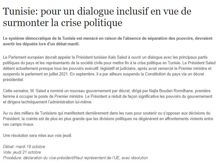Josep Borrell s’exprimera le 19 octobre 2021 lors de la séance de l’après-midi. Une résolution sera votée le jeudi 21 octobre 2021. Celle-ci, selon la même source, appellera le président de la République à entamer un dialogue avec les principaux partis politiques du pays et les représentants de la société civile pour mettre fin à la crise politique en Tunisie.