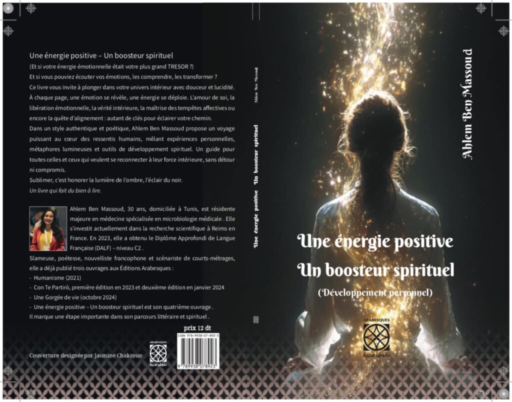 Âgée de 30 ans et domiciliée à Tunis, Ahlem Ben Massoud est résidente majeure en médecine spécialisée en microbiologie médicale et s’investit actuellement dans la recherche scientifique à Reims en France. Scientifique de renom, elle ne délaisse pas pour autant sa passion pour les arts et les lettres puisqu’elle est également slameuse, poétesse, nouvelliste francophone et scénariste de courts-métrages. « Une énergie positive-Un boosteur spirituel » est son quatrième ouvrage. Elle s’est fait connaitre auprès des lectrices et lecteurs tunisiens avec 3 succès en librairie : « Humanisme » (paru en 2021), « Con Te Partirò » avec une première édition en 2023 et deuxième édition en janvier 2024 et « Une Gorgée de vie » (octobre 2024). Tel que rappelé par « Arabesques » l’éditeur de tous ses ouvrages, son quatrième livre marque une étape importante dans son parcours littéraire et spirituel. A découvrir sans plus tarder