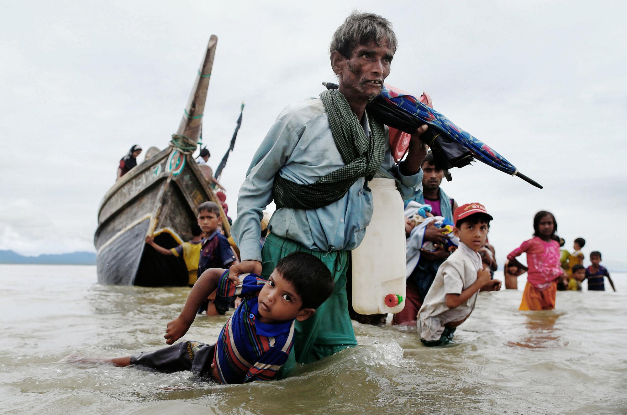 A Rohingya refugee man pulls a child as they walk to the shore after crossing the Bangladesh-Myanmar border by boat through the Bay of Bengal in Shah Porir Dwip, Bangladesh, September 10, 2017. REUTERS/Danish Siddiqui